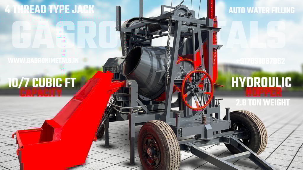The Gagroni Metals Hydraulic Hopper Lift Mixer is the pinnacle of automated on-site mixing. By integrating a high-capacity hydraulic loading hopper, this machine eliminates the back-breaking labor of manual drum loading. At the touch of a lever, the hopper lifts and feeds raw materials—cement, sand, and aggregate—directly into the drum, ensuring a faster, more consistent batch cycle. Engineered with Gagroni’s legendary durability and a reinforced hydraulic system, this mixer is designed to keep pace with high-speed construction projects while maintaining a safe, organized, and highly efficient workspace.